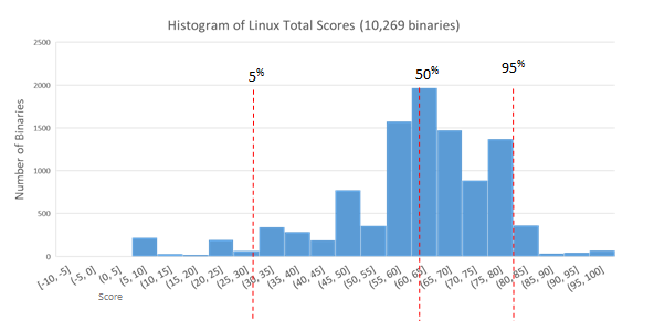 Windows shows a pretty different chart from the previous two. The bin for scores from 65-70 has about 5500 files in it. Even accounting for the increased number of files in the Windows base install, this is much higher than the biggest peaks on either of the other charts, indicating that application of armoring and security features is much more uniform for the Windows environment. Windows also has many more files with a perfect or near-perfect score than OSX or Linux had. While all three environments had the potential for a final score to be slightly over 100, this is the only environment to have any in practice.